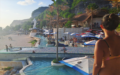 20 min from Uluwatu or Nusa DuaTropical Temptation is a luxury bohemian-styled Beach Club on one of the best beaches in South Bali. We have visited this beach club twice, read our full review here. What we like: its artsy, with classy vibes, stunning views over the ocean and cliffs of Melasti Beach, offers great food and is relatively affordable for a beach club.