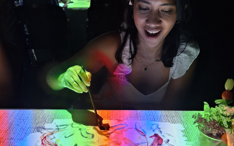 Each dish from the seven-course menu was inspired by iconic artists from the past and present. From Michelangelo to Banksy, Picasso to Pollock, and finally, Van Gogh’s Starry Night Chocolate Bar, every course was a sensory delight. Each plate came with a surprise—whether it was crafting our own drinks, making art on our plates, engaging with interactive 3D visuals, or enjoying our dinner with jazz music.
