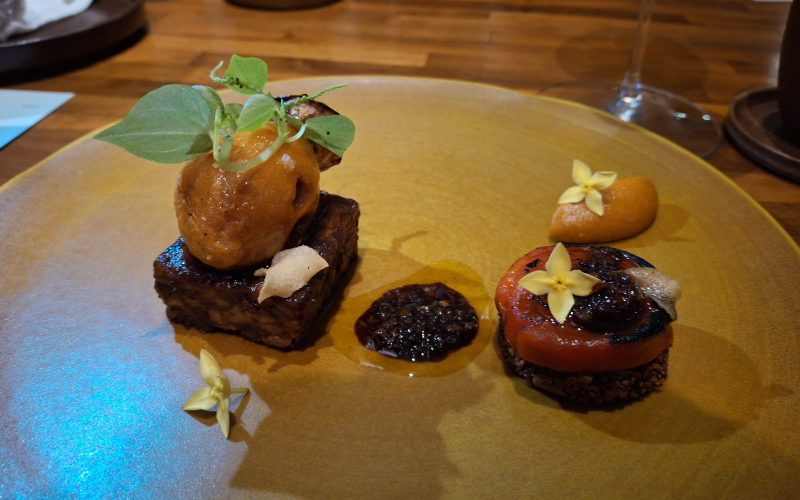 Unfortunately it was raining when we visited, so we enjoyed the full six-course experience from the Dining Room. Olivia went for the botanical option, as friends of ours told us the vegetarian menu at Mozaic is uncompromisingly good. Dirk selected the regular seasonal menu. Both come in an 8-course version too.