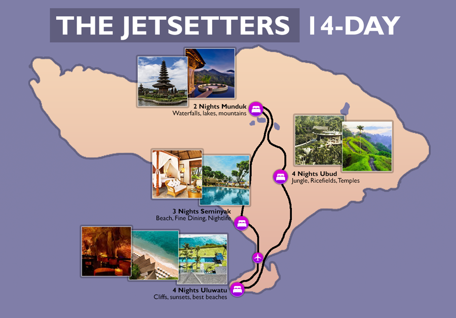 This itinerary will take you to the beaches of Seminyak, the mountains and lakes of Munduk, the jungle of Ubud and the cliffs and spectacular waves of Uluwatu. You will stay at the best hotels Bali has on offer and enjoy an unforgettable stay, and eat at <a href=”the best high-end restaurants Bali has to offer.