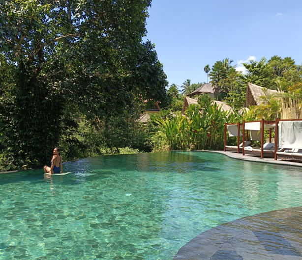 You won’t get bored here. Most nights there are arts and music performances in the main restaurant. The morning yoga classes are complimentary and hosted on a rooftop with spectacular views, and the hotel features multiple infinity pools, a hottub and a gym. Both the famous Hindu Tirta Empul Temple and the rice terraces of Tegallalang are only a few minutes away from the resort, and within 30 minutes drive you can reach central Ubud.
