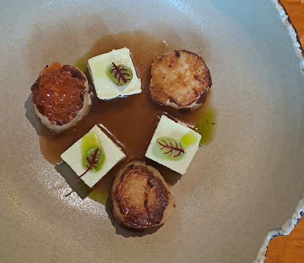 Olivia chose dishes from the a-la-carte menu, while Dirk enjoyed the 8-course Sushi Omakase. Olivia’s starter consisted of delicious grilled scallops with salmon roe and she enjoyed Wagyu Rib Eye skewers for her main. Both were grilled on the firegrill right in front of us, by friendly chefs that were keen to explain everything.