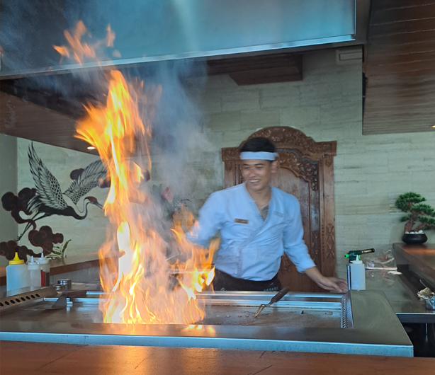 The best restaurant choice at Aksari is Kojin Teppanyaki Omakase. That’s quite a long name, lets unwrap it: Omekase means Chef’s Choice menu, meaning that they offer set tasting menus. Teppanyaki is the Japanese word for meet, fish or veggies that are prepared on a steel fire grill. The setup at Aksari is very cozy: guests are seated at a bar around the chef’s kitchen area, meaning you can see all food being prepared up close.