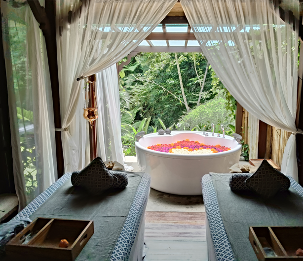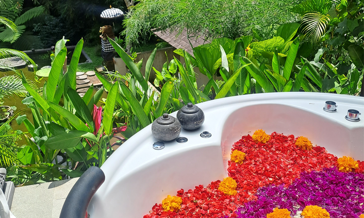 The session started with a cleansing and foot bath where our feet were filled with warm water mixed with flowers, sea salt, and lemon. Massages were done very professionally and both masseuses were very attentive to our wishes yet very friendly. Afterwards, we had a flower bath to ourselves, Olivia’s favourite overlooking the jungle’s tranquil views! During the flower bath, we were offered a refreshing rosella tea with some addictive ginger candies. Showering in the private facilities afterwards is such a pleasant experience as the amenities are complete including shampoos, conditioner, shower gel, and body lotion, all with a very Balinese scent.
