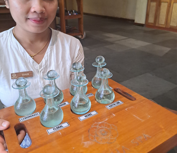 Svaha Spa is an absolutele bliss! We experienced the tropical package for couples, where we were being massaged next to each other with a beautiful setting of tropical lush forest and sounds of a river flowing in the distance. When we arrived in the Spa lobby we were handed an healthy ginger shot and a nice cold towel to clean our face which was so refreshing after a long drive from our home in Canggu. We were then given a sample of all the different oil scents to choose, something we had not experienced in a spa before. There are eight options, from soft floral to black pepper. Dirkjan chose floral oil and Olivia has her favourite rose oil. We were then escorted to the spa area passing through a beautifully decorated pond with three swans hanging peacefully.