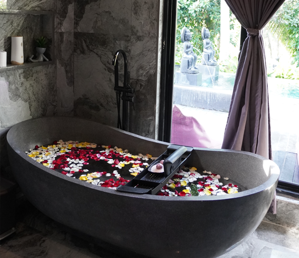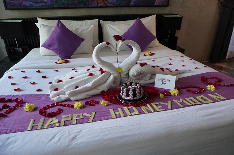 Enhancing our stay, we were welcomed by honeymoon flower decorations on the bed, cake, a fruit basket, and a flower bath in the tub. A personal touch by Capung Asri’s hospitality team was evident in the handwritten card on our bed, a thoughtful note on why the Amethyst Villa was chosen specifically for us. It made our stay even more special knowing that the team made sure we had such a holistic experience.