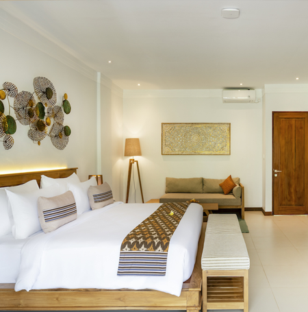 - Your spacious King Bed Jungle View Suite (68 m2 / 730 sq ft) overlooks the surrounding jungle valley. The room is designed with style and modern comfort in mind, featuring hand-made teak furniture. Your bathroom is equipped with a bathtub and shower.