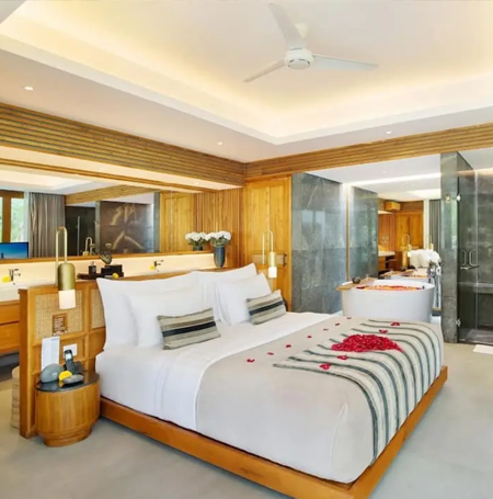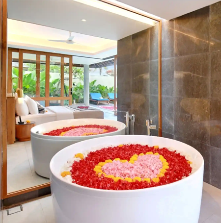 - When entering your villa, you'll be welcomed by a beautiful Balinese flower decoration, and the bath is prepared for you with flowers too!