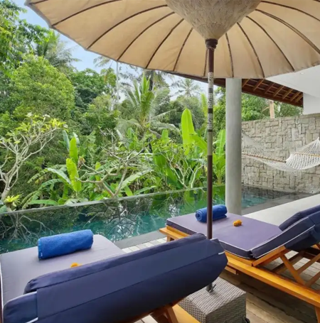 - You will stay in a spacious (110 m2, 1200 sq ft) private pool villa overlooking the rice fields. Relax on your King Bed, hammock, bath tub or private pool.