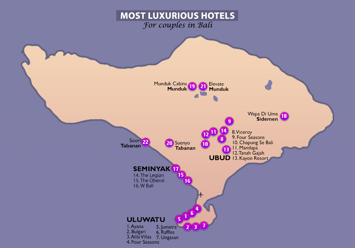 Few destinations offer as many choices for couples seeking a luxurious stay in a fancy hotel as the island of Bali in Indonesia. The Indonesian island paradise of Bali has become the high-end resort destination of choice for many. In this article we will show you our top 20+ of the best luxurious 5-star Bali hotels, all rated 9/10 or above on booking websites.