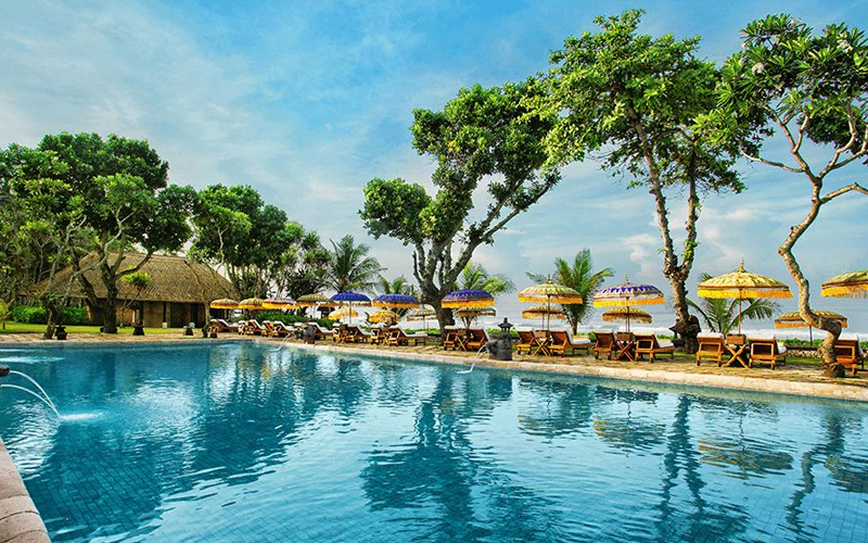 Located on Seminyak beach and embraced by fifteen acres of lush gardens, The Oberoi is a luxury sanctuary in the middle of trendy Seminyak. The hotel exudes old-world Balinese style - thatched roofs, manicured tropical gardens with tall palm trees, and a fantastic location right by the beach. Enjoy the beautiful stretch of yellow-sand Seminyak beach and majestic sunset views with all sorts of magical colors from this luxury lodge.