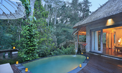 5 starSplurgeNature viewsPrivate villas10min east of Ubud.Nestled amidst Ubud's serene rice fields, the private pool villas at Tanah Gajah are just a stone's throw away from central Ubud. We believe their One Bedroom Club Pool Villa, with a private pool overlooking the rice paddies, is the best option for a honeymoon. Unique about the villas here is that they are filled with traditional Balinese and Indonesian art.